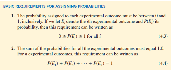 Now let us see how probabilities can be assigned to experimental outcomes. The three approaches most frequently used are the classical, relative frequency, and subjective methods. Regardless of the method used, two basic requirements for assigning probabilities must be met.