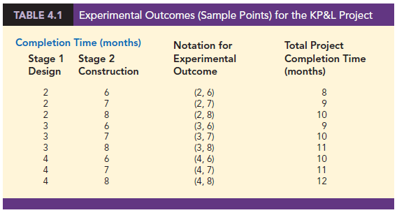 Because this project has three possible completion times for the design stage (step 1) and three possible completion times for the construction stage (step 2), the counting rule for multiple-step experiments can be applied here to determine a total of (3)(3) = 9 experimental outcomes. To describe the experimental outcomes, we use a two-number notation; for instance, (2, 6) indicates that the design stage is completed in 2 months and the construction stage is completed in 6 months. This experimental outcome results in a total of 2 + 6 = 8 months to complete the entire project. Table 4.1 summarizes the nine experimental outcomes for the KP&L problem. The tree diagram in Figure 4.3 shows how the nine outcomes (sample points) occur.