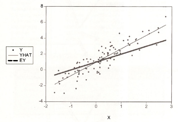 Figure 10.3 shows clearly that the slope of the regression line represented by the fitted dependent variable YHAT overstates the slope of the true population regression function. Hence, ordinary least squares is invalid in cases where x and e are correlated. The variable x is said to be endogenous. The inconsistency of the least squares estimator is due to an endogeneity problem.