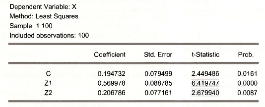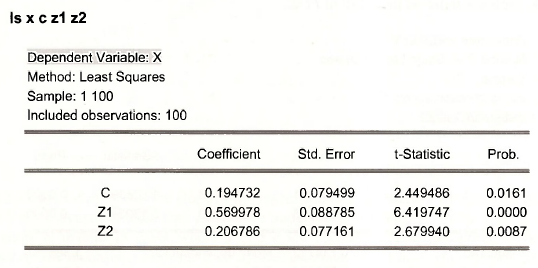 A requirement of good instrumental variables is that they be correlated with the right-hand side variable x, which is correlated with the error e. To test this we can examine the reduced form equation. Here consider the reduced form regression of* on the instruments Z1 and Z2.