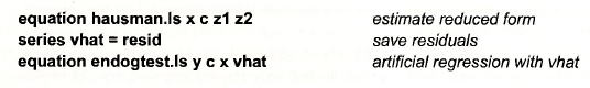 Here we conduct the Hausman Test for correlation between an explanatory variable, x, and the error term. We continue with the simulated data example. We enter the following commands in the EViews command window: