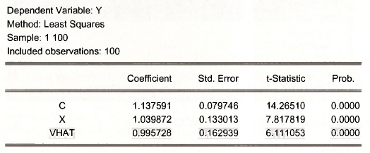 Note that the t-statistic for the coefficient on the residuals from the step one regression is 6.11 and the p-value of this test clearly shows that the /-statistic is statistically significant at the 1% level, so we reject the null hypothesis of no correlation between x and the error term e in favor of the alternative that* and e are correlated.