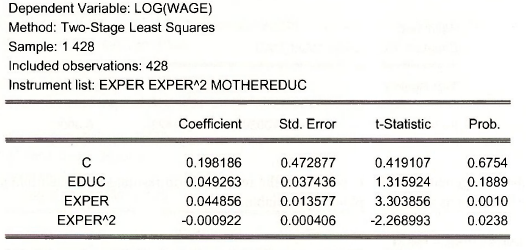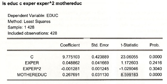 To implement two-stage least squares we first obtain the reduced form equation, adding mother’s education MOTHEREDUC as an instrumental variable.