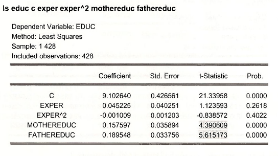 The result matches those on POE page 281. As noted in POE the concern is that the variable EDUC might be correlated with factors in the error term, such as ability. If that is the case, then the least squares estimator is biased and the bias will not disappear even if the sample size becomes very large.
