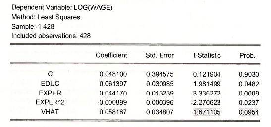 To test the endogeneity of EDUC we obtain the reduced form residuals and then include them in the wage equation as an extra explanatory variable.