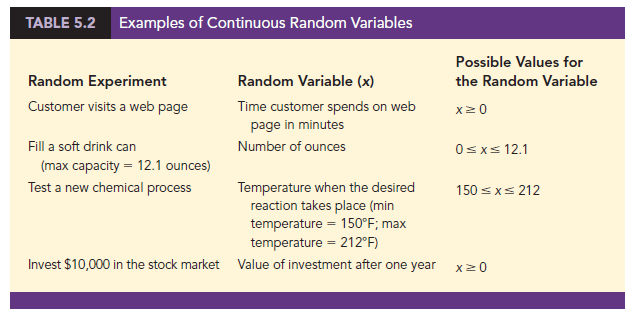 A random variable that may assume any numerical value in an interval or collection of intervals is called a continuous random variable. Experimental outcomes based on measurement scales such as time, weight, distance, and temperature can be described by continuous random variables. For example, consider an experiment of monitoring incoming telephone calls to the claims office of a major insurance company. Suppose the random variable of interest is x = the time between consecutive incoming calls in minutes. This random variable may assume any value in the interval x > 0. Actually, an infinite number of values are possible for x, including values such as 1.26 minutes, 2.751 minutes, 4.3333 minutes, and so on. As another example, consider a 90-mile section of interstate highway I-75 north of Atlanta, Georgia. For an emergency ambulance service located in Atlanta, we might define the random variable as x = number of miles to the location of the next traffic accident along this section of I-75. In this case, x would be a continuous random variable assuming any value in the interval 0 < x < 90. Additional examples of continuous random variables are listed in Table 5.2. Note that each example describes a random variable that may assume any value in an interval of values. Continuous random variables and their probability distributions will be the topic of Chapter 6.
