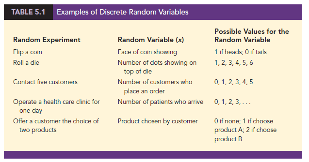 Table 5.1 provides some additional examples of discrete random variables. Note that in each example the discrete random variable assumes a finite number of values or an infinite sequence of values such as 0, 1, 2, . . . . These types of discrete random variables are discussed in detail in this chapter.