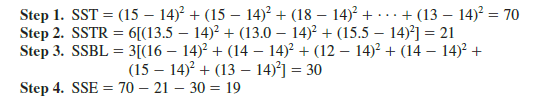 The ANOVA procedure for the randomized block design requires us to partition the sum of squares total (SST) into three groups: sum of squares due to treatments (SSTR), sum of squares due to blocks (SSBL), and sum of squares due to error (SSE). The formula for this partitioning follows.