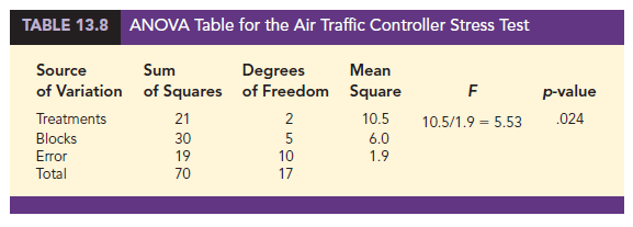 Note that the ANOVA table also shows how the nT – 1 total degrees of freedom are partitioned such that k – 1 degrees of freedom go to treatments, b – 1 go to blocks, and (k – 1)(b – 1) go to the error term. The mean square column shows the sum of squares divided by the degrees of freedom, and F = MSTR/MSE is the F ratio used to test for a significant difference among the treatment means. The primary contribution of the randomized block design is that by including blocks, we remove the individual controller differences from the MSE term and obtain a more powerful test for the stress differences in the three workstation alternatives.