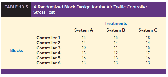 One way to separate the effect of the individual differences is to use a randomized block design. Such a design will identify the variability stemming from individual controller differences and remove it from the MSE term. The randomized block design calls for a single sample of controllers. Each controller in the sample is tested with each of the three workstation alternatives. In experimental design terminology, the workstation is the factor of interest and the controllers are the blocks. The three treatments or populations associated with the workstation factor correspond to the three workstation alternatives. For simplicity, we refer to the workstation alternatives as system A, system B, and system C.