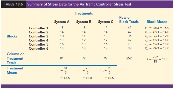 Table 13.6 is a summary of the stress data collected. In this table we include column totals (treatments) and row totals (blocks) as well as some sample means that will be helpful in making the sum of squares computations for the ANOVA procedure. Because lower stress values are viewed as better, the sample data seem to favor system B with its mean stress rating of 13. However, the usual question remains: Do the sample results justify the conclusion that the population mean stress levels for the three systems differ? That is, are the differences statistically significant? An analysis of variance computation similar to the one performed for the completely randomized design can be used to answer this statistical question.