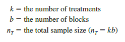 To compute the F statistic needed to test for a difference among treatment means with a randomized block design, we need to compute MSTR and MSE. To calculate these two mean squares, we must first compute SSTR and SSE; in doing so, we will also compute SSBL and SST. To simplify the presentation, we perform the calculations in four steps. In addition to k, b, and nT as previously defined, the following notation is used.