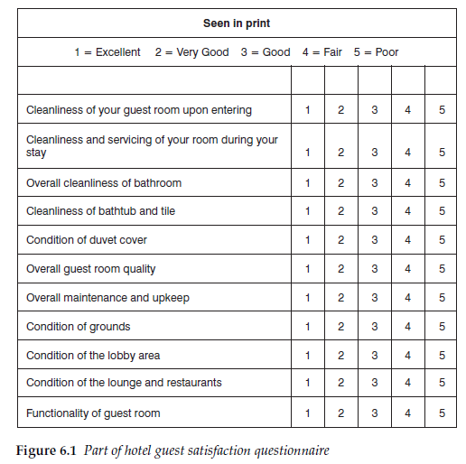 Scales such as these are commonly found on questionnaires left in hotel rooms, and Figure 6.1 shows the first part of one of these. The questionnaire continued with 53 attributes in total to be rated on this scale and 12 other questions. It contained no instructions other than to define the points of the scale, thus assuming that its clients have a reasonable level of familiarity with questionnaire completion.