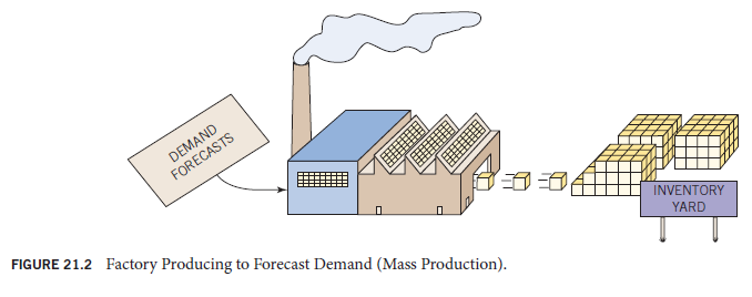 Mass production manufacturers set their production schedules based on a forecast of future needs, which, in turn, is based on historical data and trend analysis (see Figure 21.2). The great weakness of this system is that no one can predict the future with sufficient certainty, even with a complete and perfect understanding of the past and a good sense of current trends in the marketplace. One does not have to search long to find examples of failed attempts to correctly project the marketability of products. The Edsel is one of many automobiles that were released with great fanfare to a disinterested public. A new formula for Coca-Cola introduced in the late 1980s is another example of market predictions gone awry. IBM has case after case involving personal computers, such as the unlamented IBM PC Jr. (which failed in the marketplace in spite of the best market research IBM could muster). These failures demonstrate the difficulty of trying to determine beforehand what will sell and in what quantity.