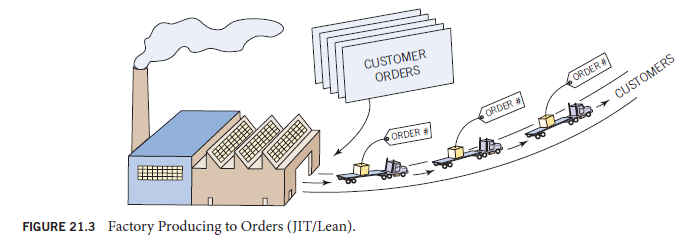 Even products that are successful in the market have limits as to the quantities that buyers will absorb. When production is based on predictions of the future, risk of loss from overproduction is far greater than when production is based on actual demand. The previous section defined JIT/Lean as producing what is needed, only when it is needed, and only in the quantity that is needed (see Figure 21.3). The result of JIT/Lean is that no goods are produced without demand. This, in turn, means no goods are produced that cannot be sold at a price that supports the viability of the company.