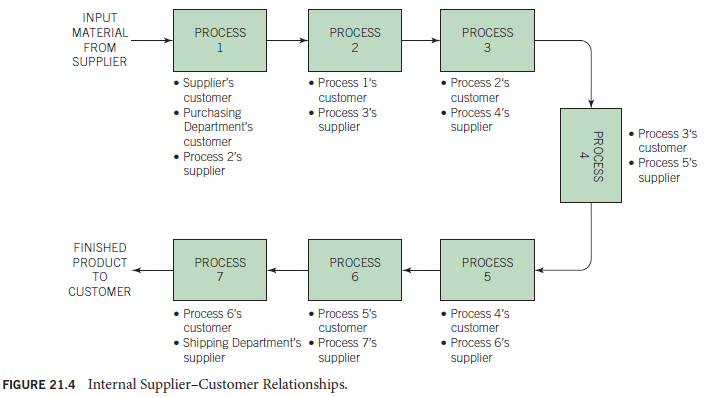So far, we have viewed JIT/Lean from the point of view of the manufacturer and the ultimate purchaser of the product— the producer and the customer. But if we look at the complete production process, we will find that it contains many producers and customers—internal producers and customers (see Figure 21.4). Each preceding process in the overall system is a producer, or supplier, and each succeeding process is a customer (see Chapter 7). JIT/Lean fits here as well as or better than with the manufacturer-and-purchaser model. No process in the system produces its output product until it is signaled to do so by the succeeding process. This can eliminate waste on a grand scale. It is the elimination of waste that justifies JIT/ Lean in any kind of manufacturing operation. Eliminating waste is translated into improving quality and lowering costs. Improving quality and lowering costs translate into becoming more competitive. Although improving competitiveness does not assure survival (the competition may still be ahead of you), being noncompetitive surely guarantees disaster.