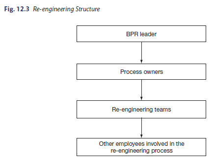 The usual re-engineering structure6 consists of the BPR leader, process owner, re-engineering teams and other employees involved in the re-engineering process and are displayed in Figure 12.3.