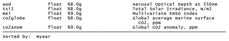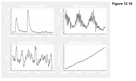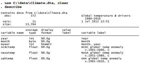 The 1980-2010 time window covered by Climate.dta was constrained by available data: the global average CO2 level time series used here begins in 1980, and the Aerosol Optical Depth data had been updated, at this writing, only through 2010. This file is tsset by myear, a monthly variable defined from separate month and year variables found in the original data sources. Internally, Stata defines monthly variables as the number of months since January 1960, just as it defines date variables as the number of days since January 1, 1960. Here myear has a %tmmCY format, so it will appear to us as Jan1980, Feb1980 and so forth. If not already done, creating this monthly time variable and tsseting the data would be necessary steps for later analysis.