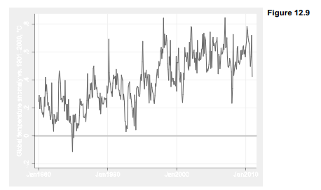 All but two months in Figure 12.9 have temperatures above the 20th-century mean. The warming trend has been particularly steep since the mid-1970s, a period mostly captured by this graph. Its central high point is the globally hot month of February 1998, not surpassed (and then just barely) until January 2007. Both are more than two standard deviations higher than any month before 1980 in the NCDC data, which go back to 1880 (see Figure 2.1 in Chapter 2). However, warm temperatures through much of1998, together with cooler temperatures in some recent years, create a visual impression that global warming might have paused during the past decade. The final section of this chapter applies time series modeling to investigate possible explanations.