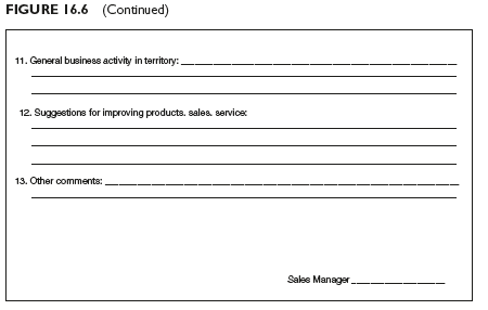Field sales executives have responsibility for reporting information on personnel performance. Since they are in contact with the sales force most frequently, they are well placed to observe individual sales personnel in the field. Consequently, field sales executives prepare “sales personnel evaluation” reports, often of the merit-rating type, which gather information on qualitative sales performances. In some companies, this is called a “progress report” and includes qualitative information on personnel performance and data comparing individual performance to quantitative standards. See Figure 16.6 for a progress report. Sales personnel evaluation reports are prepared either periodically or each time a district sales manager or supervisor works with a salesperson. As companies increasingly utilize centralized data-processing facilities for processing quantitative data, the role of the district sales office in gathering, collating, and reporting quantitative sales performance data has declined. But no good substitute method for gathering information on qualitative aspects of personnel performances has been found, and the district sales manager continues as the main unit for gathering such information.
