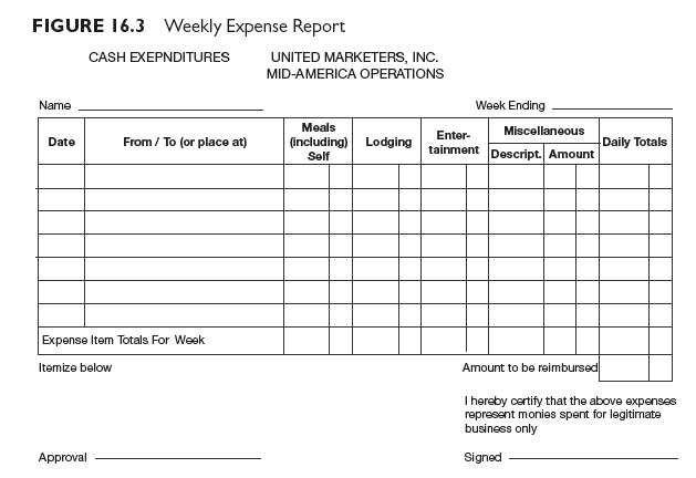 - Expense report. Because most sales personnel are reimbursed for expenses and itemized expense records are required for income tax purposes, most companies have an expense report. From sales management’s standpoint, the purpose is to control the nature and amount of salespersons’ expenses. This report also helps the salesperson exercise self-control over expenses. The expense report reminds salespersons that they are under moral obligation to keep expenses in line with reported sales— some expense report forms require salespersons to “correlate” expenses with sales. The details of the report form vary with the plan for reimbursing expenses. A Weekly Expense Form is shown in Figure 16.3.