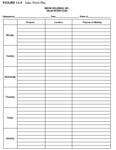 - Sales work plan. The salesperson submits a work plan (giving such details as accounts and prospects to be called upon, products and other matters to be discussed, routes to be traveled, and hotels or motels) for a future period, usually a week or a month (see Figure 16.4). The purposes are to assist the salesperson in planning and scheduling activities and to inform management of the salesperson’s whereabouts. The work plan provides a basis for evaluating the salesperson’s ability “to plan the work and to work the plan.”