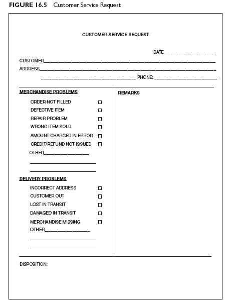 - Report of complaint and/or adjustment. This report provides information for analyzing complaints arising from a salesperson’s work, complaints by class of customer, and cost of complaint adjustment. This helps management in detecting needed product improvements and changes in merchandising and service practices and policies. These data also are helpful for decisions on sales training programs, selective selling, and product changes (see Figure 16.5)
