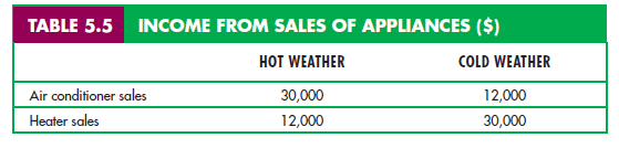 single product. Suppose there is a 0.5 probability that it will be a relatively hot year, and a 0.5 probability that it will be cold. Table 5.5 gives the earnings that you can make selling air conditioners and heaters.