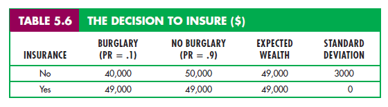 To clarify this point, let’s suppose a homeowner faces a 10-percent probabil- ity that his house will be burglarized and he will suffer a $10,000 loss. Let’s assume he has $50,000 worth of property. Table 5.6 shows his wealth in two situ- ations—with insurance costing $1000 and without insurance.