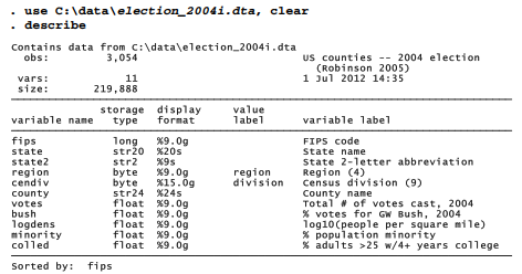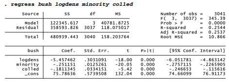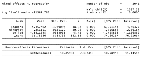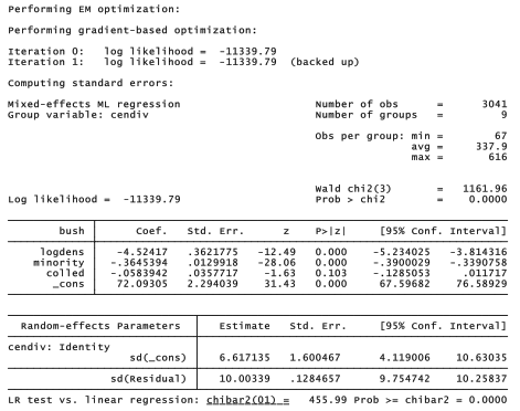 To illustrate xtmixed, we begin with county-level data on votes in the 2004 presidential election (Robinson 2005). In this election, George W. Bush (receiving 50.7% of the popular vote) defeated John Kerry (48.3%) and Ralph Nader (0.4%). One striking aspect of this election was its geographical pattern: Kerry won states on the West coast, the Northeast, and around the Great Lakes, while Bush won everywhere else. Within states, Bush’s support tended to be stronger in rural areas, whereas Kerry’s votes concentrated more in the cities. Dataset election_2004i contains election results and other variables covering most U.S. counties. A categorical variable notes census divisions (cendiv), which divide the U.S. into 9 geographical areas. Variables include the total number of votes cast (votes), the percent for Bush (bush), logarithm of population density (logdens) as an indicator of rural-ness, and other variables for the percent of county population belonging to ethnic minorities (minority), or adults having college degrees (colled).