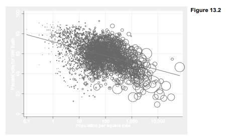 As Figure 13.2 confirms, the percent voting for George W. Bush tended to be lower in high- density, urban counties. It tended also to be lower in counties with substantial minority populations, or a greater proportion of adults with college degrees.