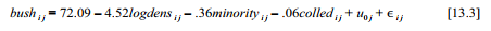 Equation [13.2] depicts the value ofy for the ith county and thejth census division as a function of Xi, x2 and x3 effects that are the same for all divisions. The random intercept u0 j , however, allows for the possibility that the mean percent voting for Bush is systematically higher or lower among the counties of some divisions. That seems appropriate with regard to U.S. voting, given the obvious geographical patterns. We can estimate a model with random intercepts for each census division by adding a new random-effects part to the xtmixed command: