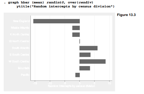 Although xtmixed does not directly calculate random effects, we can obtain the best linear unbiased predictions (BLUPS) of random effects through predict. The following commands create a new variable named randintO, containing the predicted random intercepts, and then graph each census division’s random intercept in a bar chart (Figure 13.3).