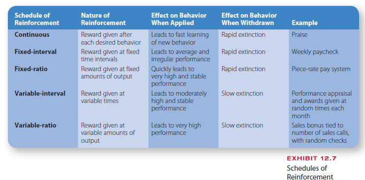 The schedules of reinforcement are illustrated in Exhibit 12.7. Continuous reinforce- ment is most effective for establishing new learning, but behavior is vulnerable to extinc- tion. Partial reinforcement schedules are more effective for maintaining behavior over extended time periods. The most powerful is the variable-ratio schedule because employee behavior will persist for a long time due to the random administration of reinforcement only after a long interval.46