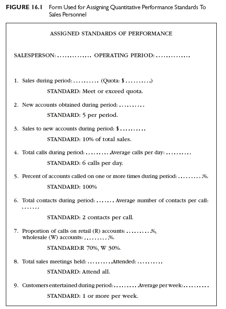 Multiple quantitative performance standards. It is widespread practice to assign multiple quantitative performance standards. Figure 16.1 shows a form used by a company whose sales personnel are assigned nine different quantitative standards per operating period.