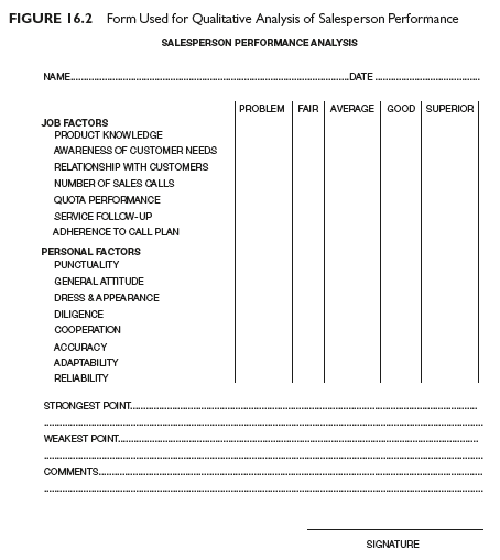 Certain aspects of job performance, such as personal effectiveness in handling customer relations problems, do not lend themselves to precise measurement, so the use of some qualitative criteria is unavoidable. Qualitative criteria are used for appraising performance characteristics that affect sales results, especially over the long run, but whose degree of excellence can be evaluated only subjectively. Qualitative criteria defy exact definition. Many sales executives, perhaps most, do not define the desired qualitative characteristics with any exactitude; instead, they arrive at informal conclusions regarding the extent to which each salesperson possesses them. Other executives consider the qualitative factors formally—one method being to rate sales personnel against a detailed checklist of subjective factors such as that shown in Figure 16.2.