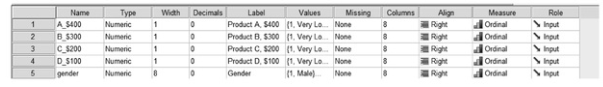 Figure 10.1 shows the Data View for 12 participants who were asked to rate four products (A_$400,B_$300, C_$200, D_$100) from 1 (very low quality) to 7 (very high quality). The participants were also asked their gender (1 = male, 2 = female). Thus, subjects 1-6 are males, and 7-12 are females.