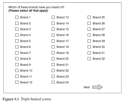 Where a single question per screen is used, a need for the respondent to scroll down should be avoided. All response codes should be included on the same screen if at all possible. This may mean double or triple banking them (Figure 9.1). If it is necessary to scroll down, many respondents will not realize the need to do so. Even if they have to scroll down in order to progress to the next question, they will tend to use the responses first apparent to them that they saw initially. An exception might be for a factual question where respondents have to scroll down to find their make of car or country of residence, where they are aware that they have to keep scrolling to find the answer they need.