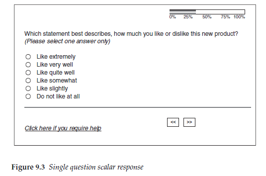 Electronic questionnaires, either online web-based or self-completion CAPI, provide alternative means of presenting scales and recording responses to those available on paper questionnaires. A simple version is the single question with a scalar response presented as radio buttons (Figure 9.3).