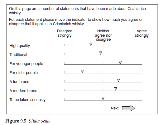 The use of different types of slider scales (see Figure 9.5), visual analog scales or graphic rating scales in electronic questionnaires has been discussed in Chapter 5, but we should note again here that it has been shown that whilst most respondents prefer a scale with defined points, such as radio buttons, because they believe that it is more difficult to give consistent answers with a slider scale, both slider scales and scales with defined responses give similar data distributions (Van Schaik and Ling, 2007).