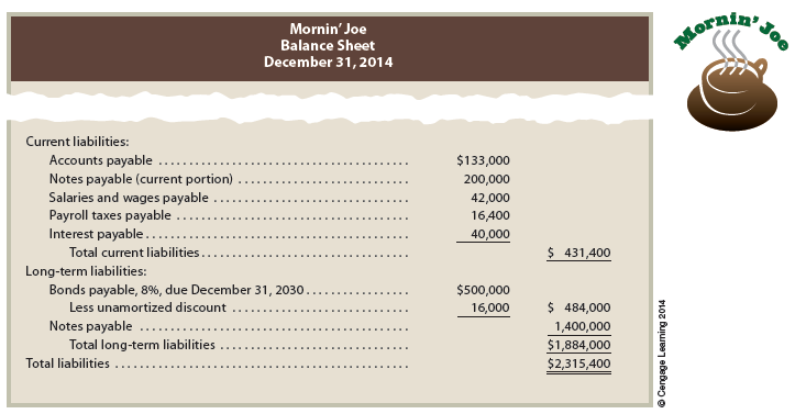 The reporting of bonds and notes payable for Mornin’ Joe is shown below.
