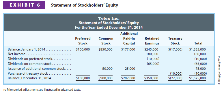 A statement of stockholders’ equity is normally prepared in a columnar format. Each column is a major stockholders’ equity classification. Changes in each classification are then described in the left-hand column. Exhibit 6 illustrates a statement of stockholders’ equity for Telex Inc.