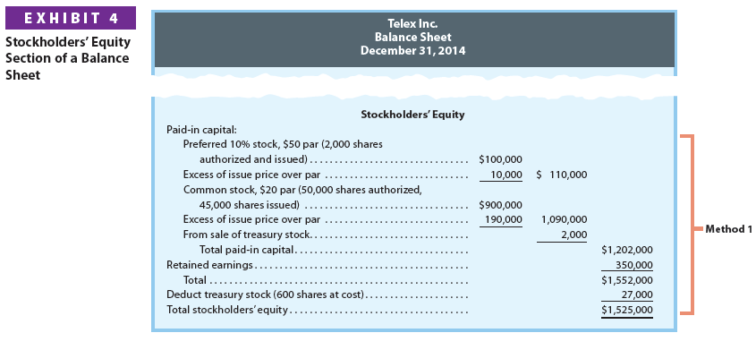 Exhibit 4 shows two methods for reporting stockholders’ equity for the December 31, 2014, balance sheet for Telex Inc.