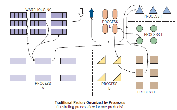 The chart at the top of Figure 21.9 represents the old process-oriented traditional factory. Each of the processes has its own territory within the plant. Additionally, an area dedicated to warehousing is used for storage of production materials, work-in-process that is waiting for the next process, and perhaps finished goods awaiting orders. There is also an area set aside for shipping and receiving. Materials are received, inspected, processed, and sent to the warehouse area. Finished goods are taken from the warehouse or from final assembly, packed, and shipped. The upper illustration in Figure 21.9 maps the movement from the warehouse through the processes and finally to shipping in a traditional factory.