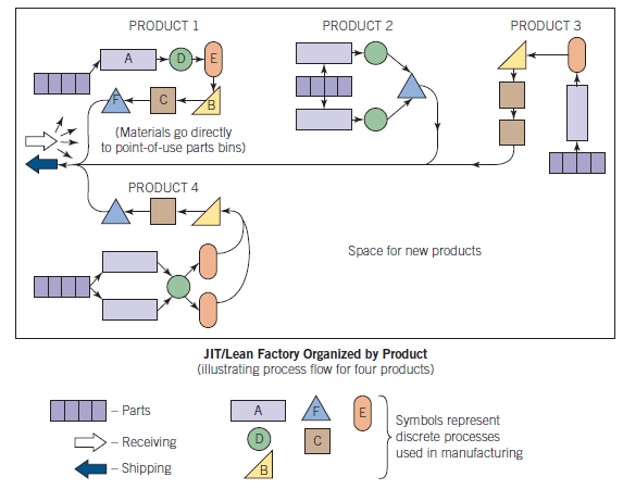 The lower illustration in Figure 21.9 represents a JIT/ Lean factory that is set up to manufacture four different products. The warehousing area is gone. This cannot happen overnight, but an objective of JIT/Lean is to eliminate all inventories. The second thing to notice is that the factory is divided into discrete areas dedicated to the different products rather than to the different processes. Each product area is equipped with the processes required for that product. Parts bins are located right in the work area. These bins may have enough to last from a few hours to a few days or more, depending on the degree of maturity of the JIT/Lean