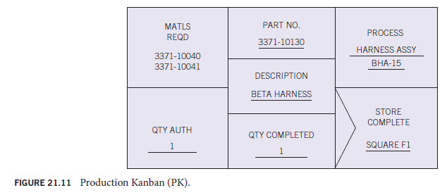 - The production kanban authorizes a process to produce another lot of one or more pieces as specified by the kanban (see Figure 21.11). This kanban also describes the piece(s) authorized, identifies the materials to be used, designates the producing process workstation, and tells the producing process what to do with it when it is completed.