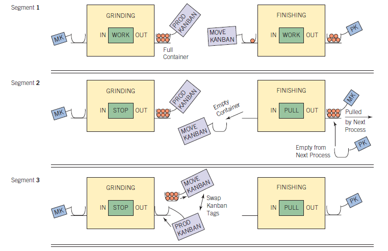 Segment 1 reveals that the finishing workstation has containers at both its In and Out areas. The container at the In area carries a move kanban (MK) and has one part left to be used. The container at the Out area has five finished parts in it and is waiting for the sixth. Back at the grinding workstation, the Out container is filled with the six parts authorized by the production kanban (PK) attached. The container at the In area is empty, and work is stopped until another production kanban appears.