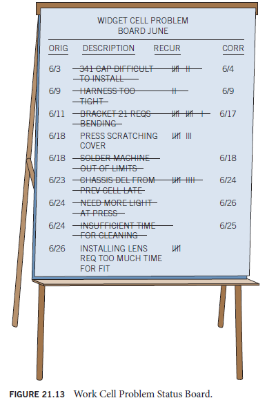 Each product work cell or team should have one or more boards, perhaps on easels, perhaps on computer screens, on which they post information. For example, if the schedule anticipates the production of 300 subassemblies for the day, the workers will check off the appropriate number each time a succeeding process pulls subassemblies from its output. This keeps the team apprised of how it is doing and presents the information to managers, who only have to glance at the chart to gauge the work cell activity and its kanbans to develop a clear picture of how well the line is doing. Another board charts statistical process control data as the samples are taken in the work cell. Anyone can spot developing trends or confirm the well-being of the process with a quick look at the charts. Every time a problem beyond the control of the work cell or an issue with which the work cell needs help comes up, it is jotted down on a board. It stays there until resolved. If it repeats before it is resolved, annotations are made in the form of four marks and a slash for a count of five (see Figure 21.13). This keeps the concerns of the work cell in front of the managers and engineers who have the responsibility for resolution. The mark tally also establishes a priority for resolution. The longest mark “bar” gets the highest priority. Maintenance schedules for tools and machines are also posted in plain view, usually right at or on the machine, and normal maintenance activity, such as lubrication, cleaning, and cutter replacement, is assigned to the work cell.