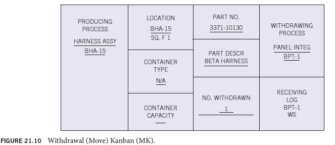 - The withdrawal kanban, also called the move kanban, is used to authorize the movement of materials or WIP from one process to another (see Figure 21.10). This kanban will contain information about the item it is authorizing for withdrawal, the quantity, the identity of the containers used, and the two processes involved supplying and receiving.