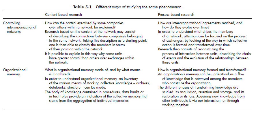 One of the objectives of this chapter is to show that most management subjects can be apprehended in terms of either dimension: content or process. The main difference between these two types of research lies essentially in the formulation of the research question and the methodology chosen. Table 5.1 illustrates the differences between these two ways of approaching a research topic, using two different studies – of interorganizational network control and of organizational memory – as examples.